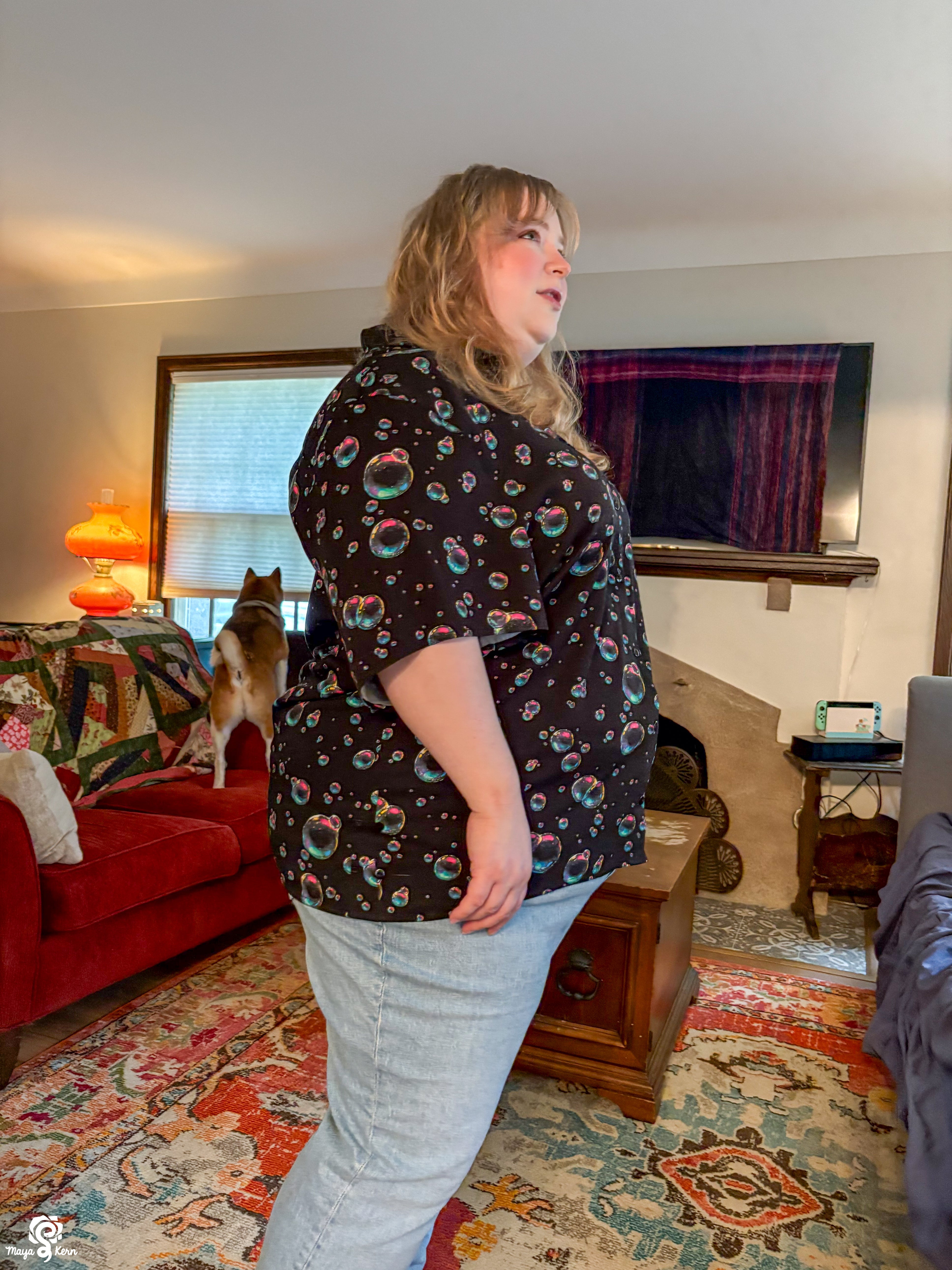 A short sleeved button-up shirt featuring my Bubbles design. This pattern depicts various multicolored bubbles on a black background.