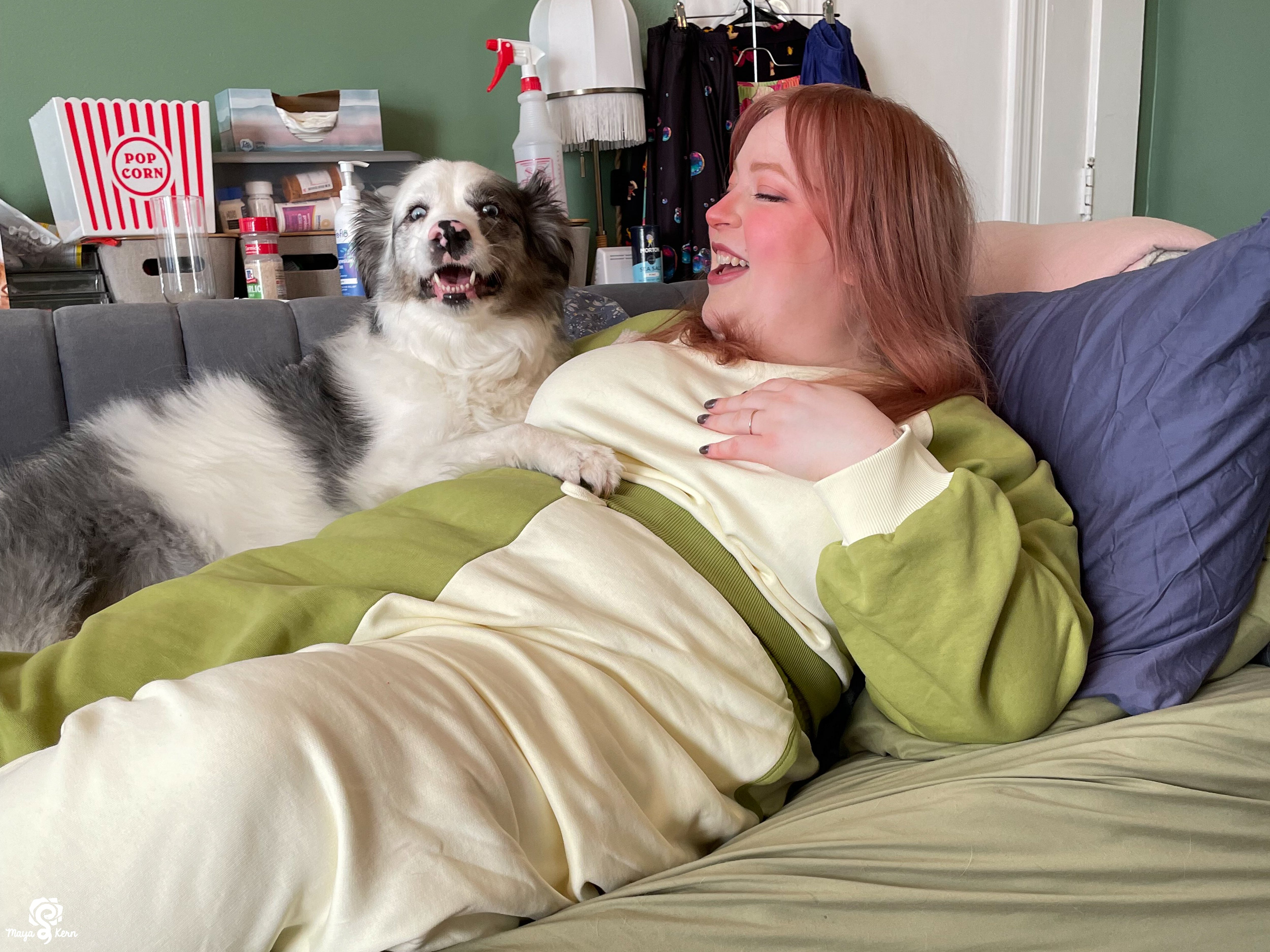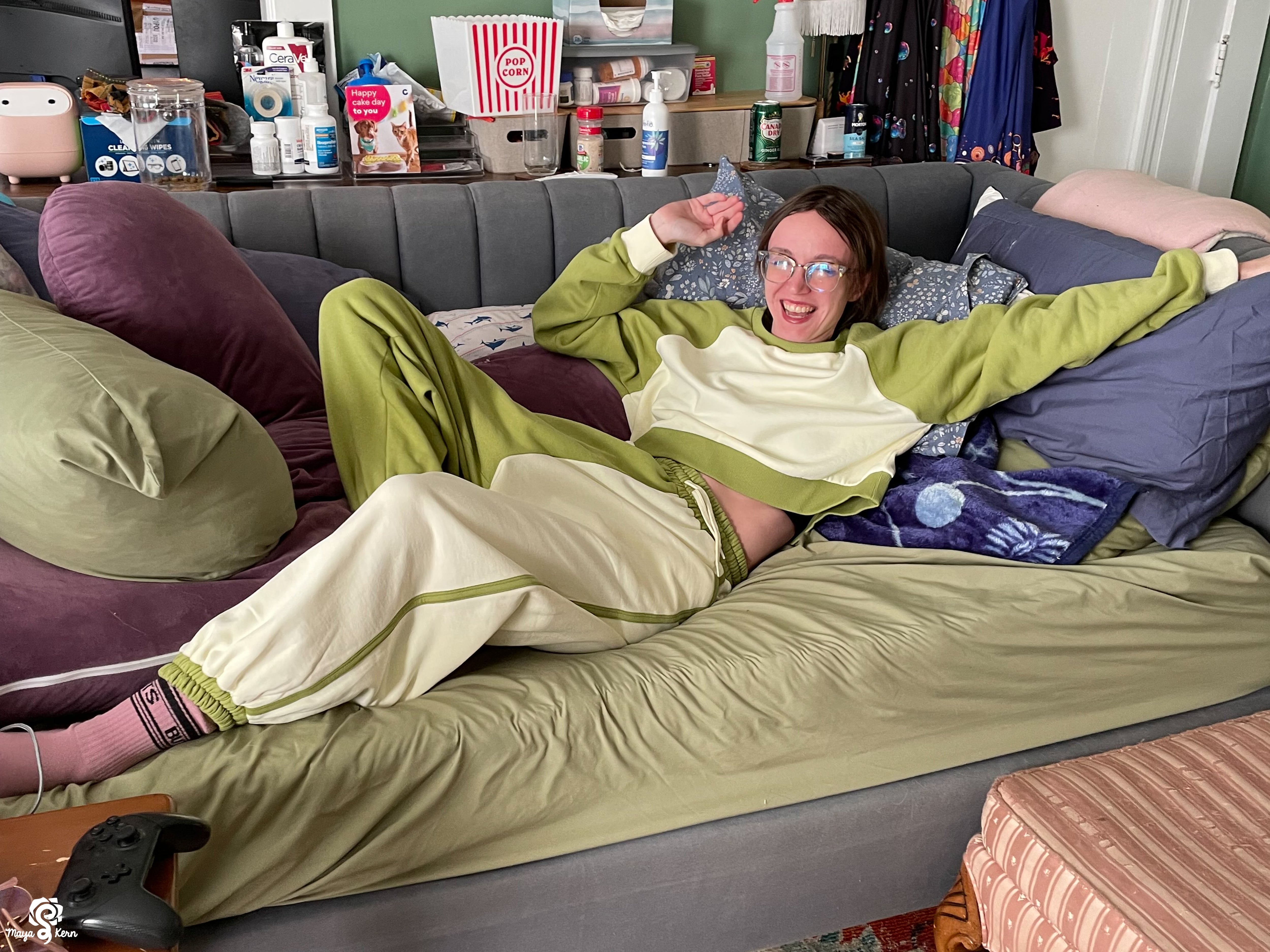 Devin is wearing the cozy sweater in size Small