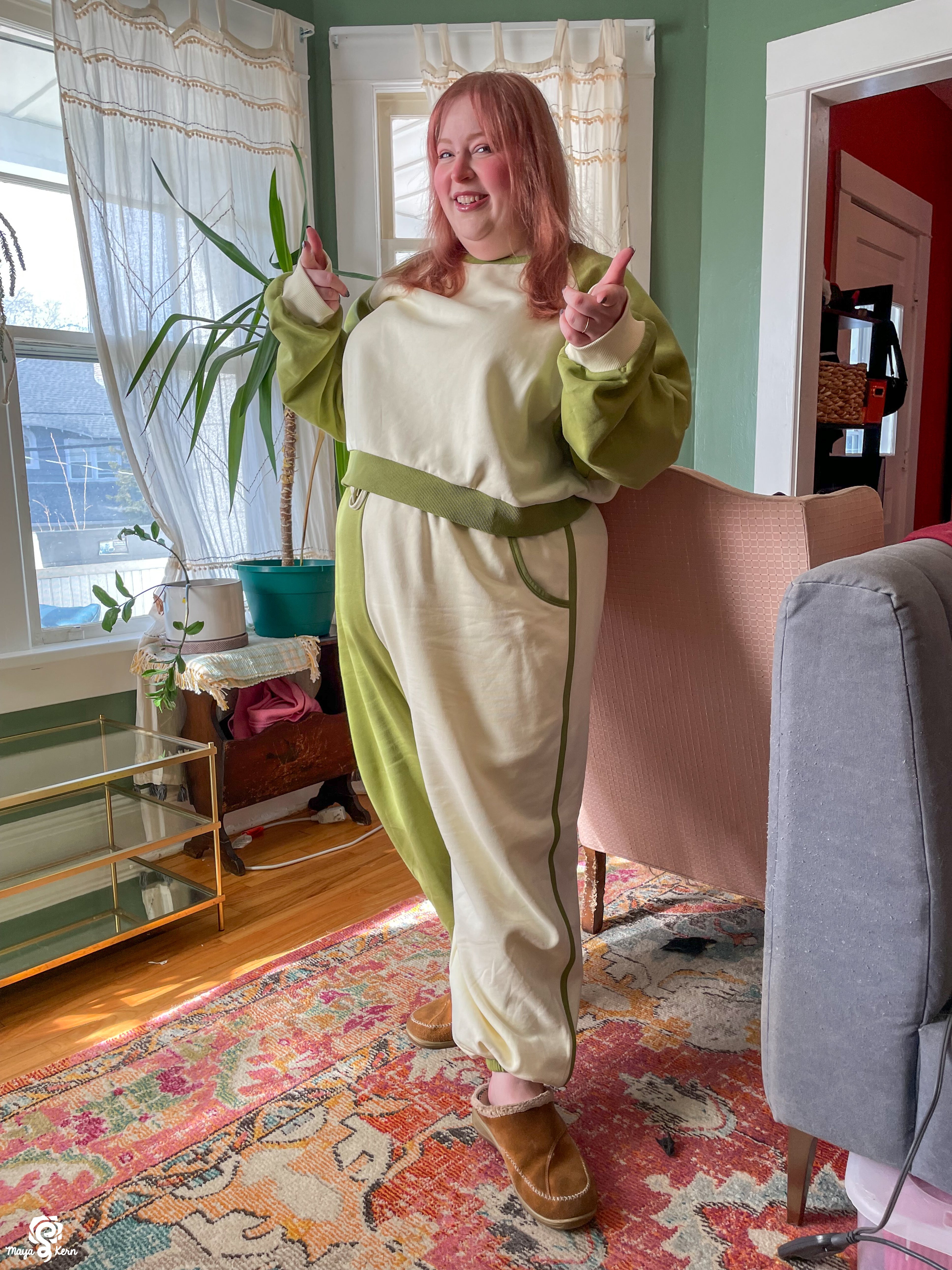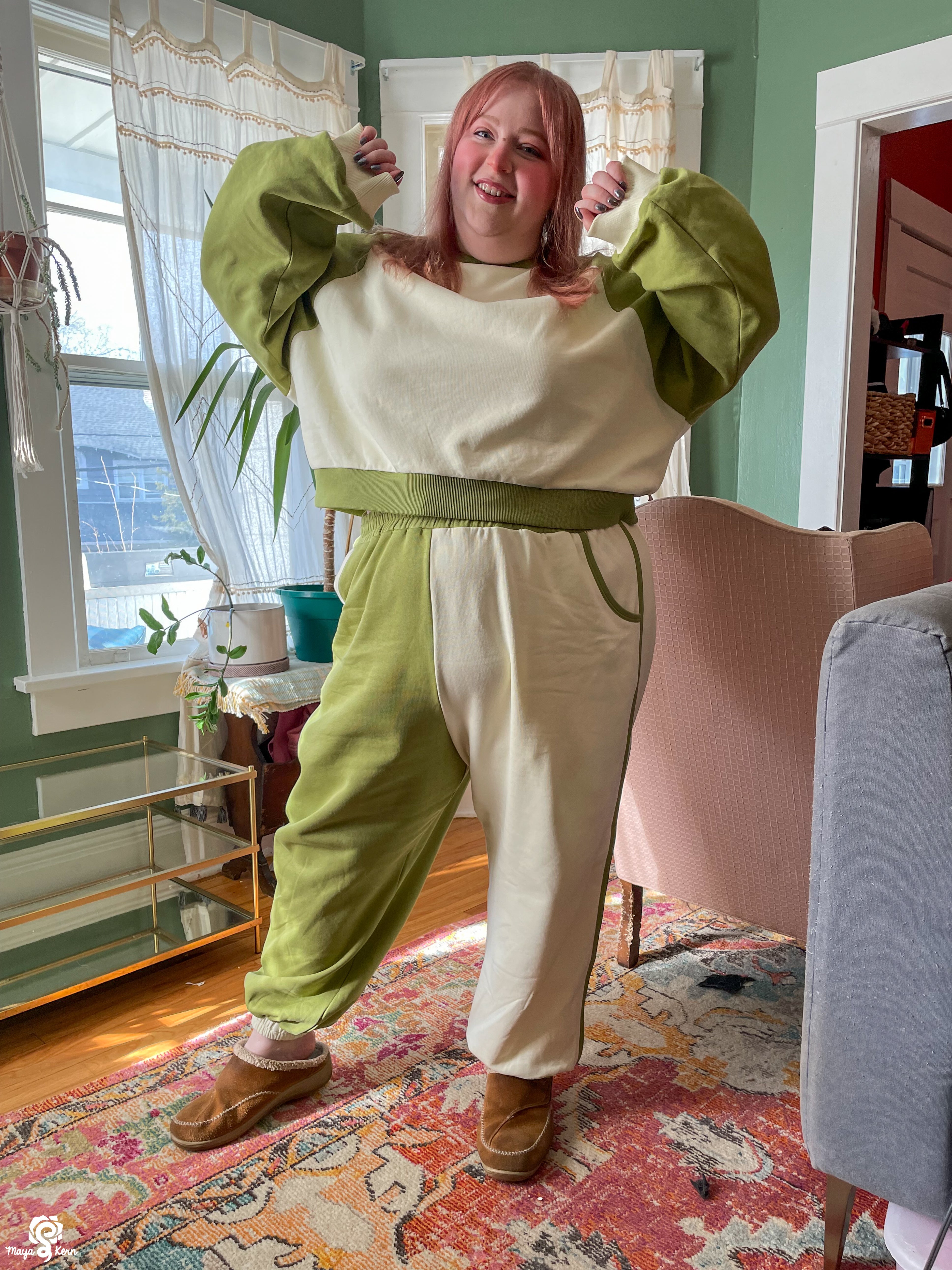 This color blocked sweater features a warm white torso and ribbed cuffs, while the sleeves and ribbed neckline and bottom hem are a warm, mossy green that perfectly resembles a delicious matcha latte.
