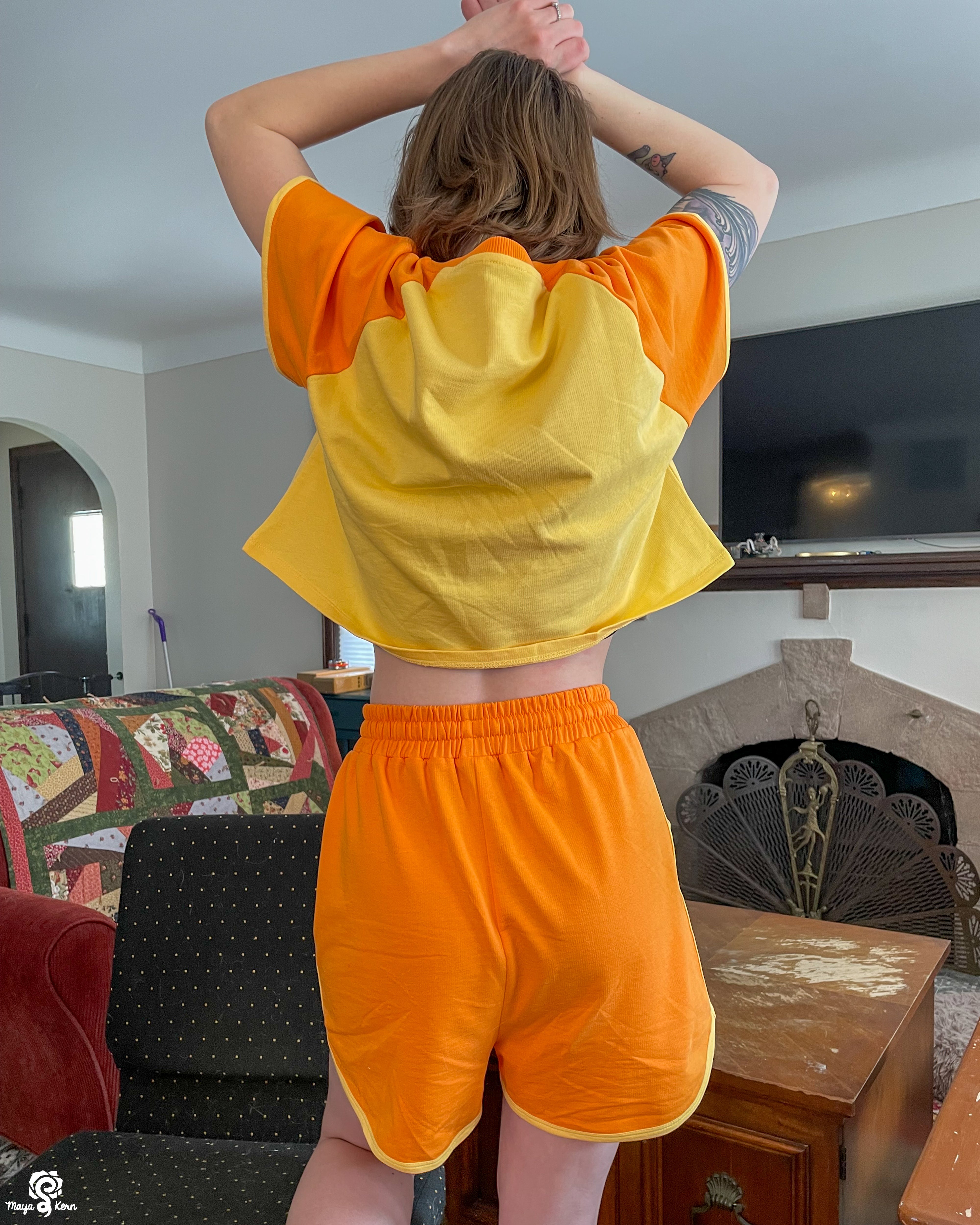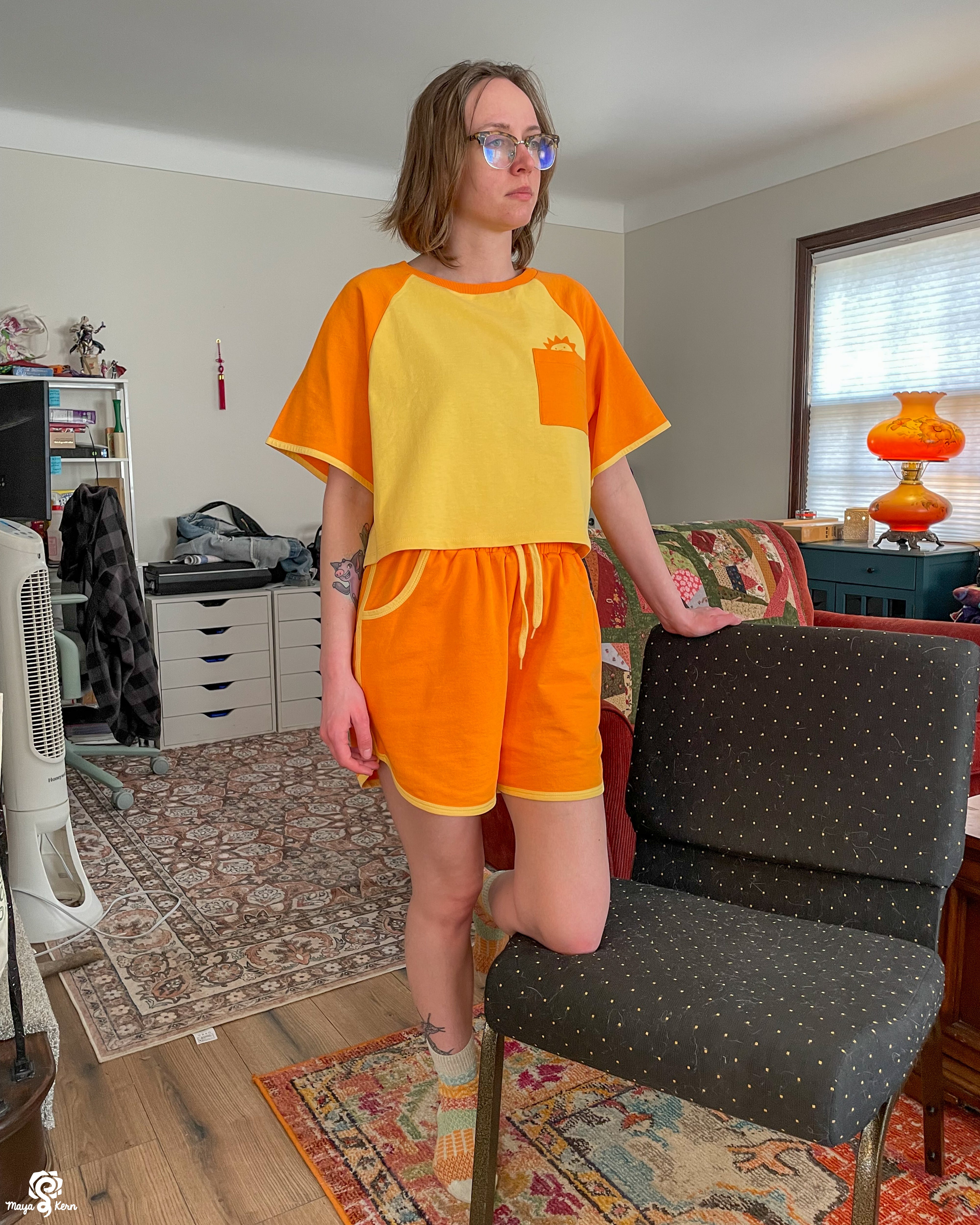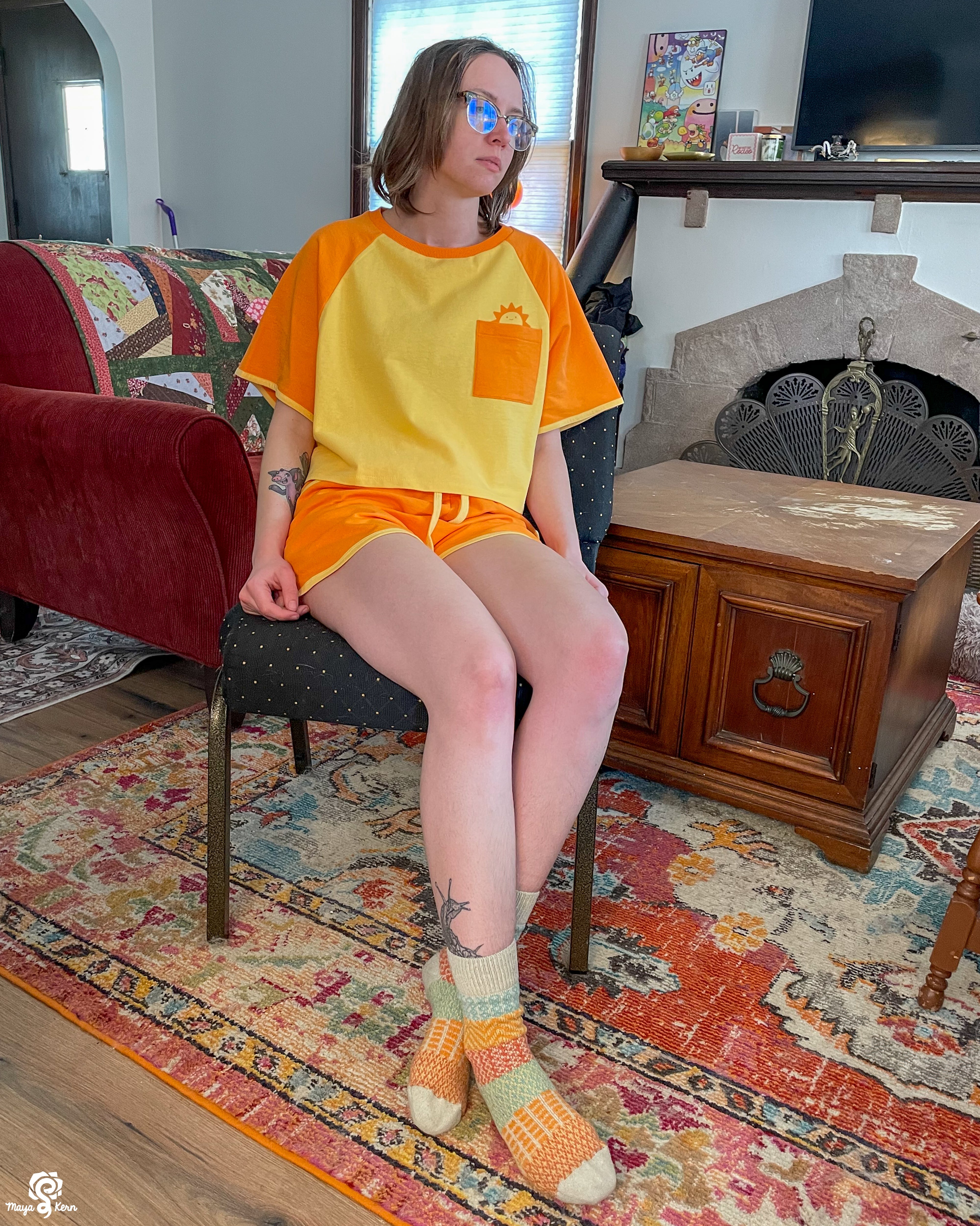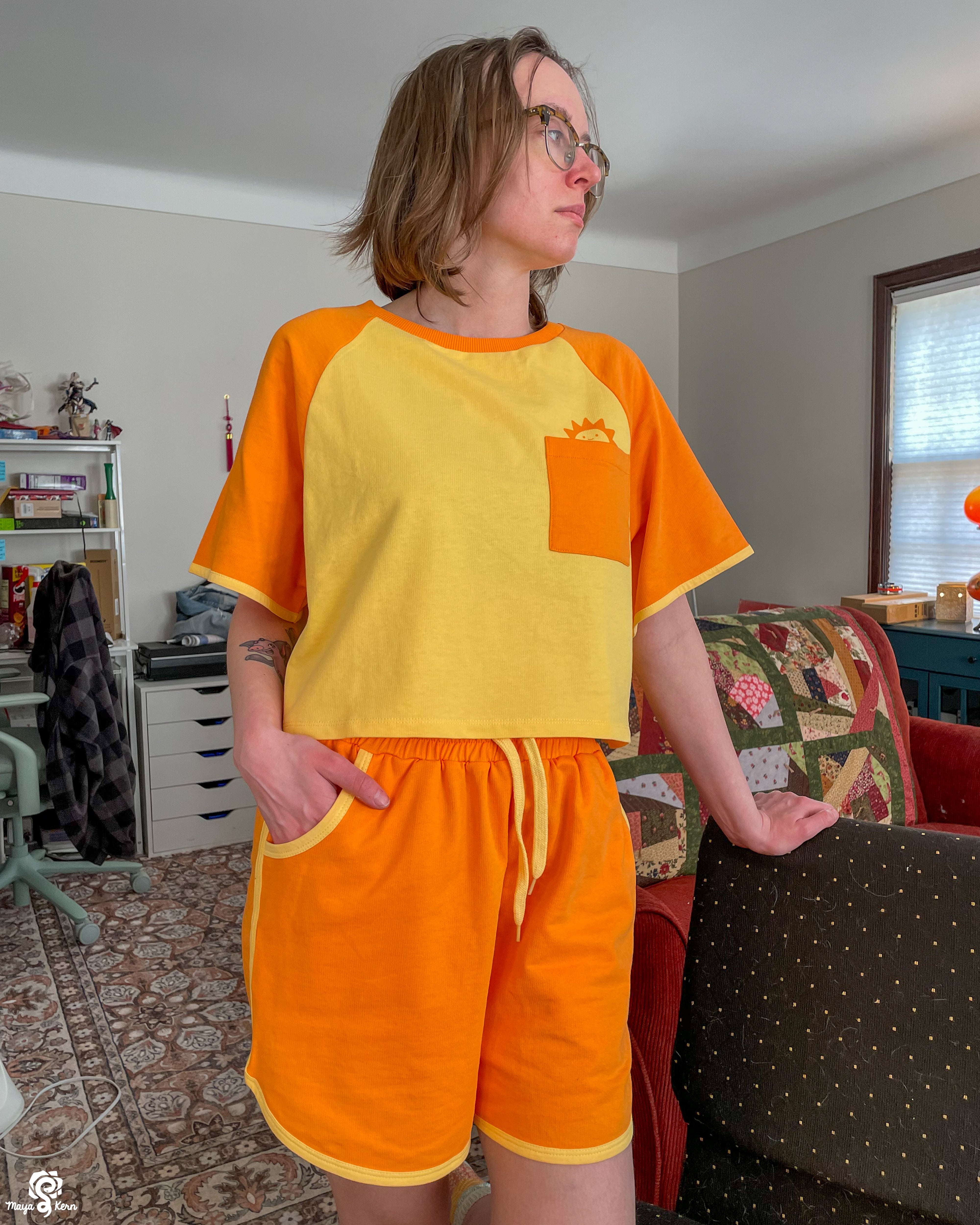 This color blocked tee features a warm and buttery yellow body, a vibrant and sunny orange neckline, sleeves and pocket, and yellow piping on the bottom of the sleeves. There is also a screen printed happy little orange sun peeking out of the pocket.