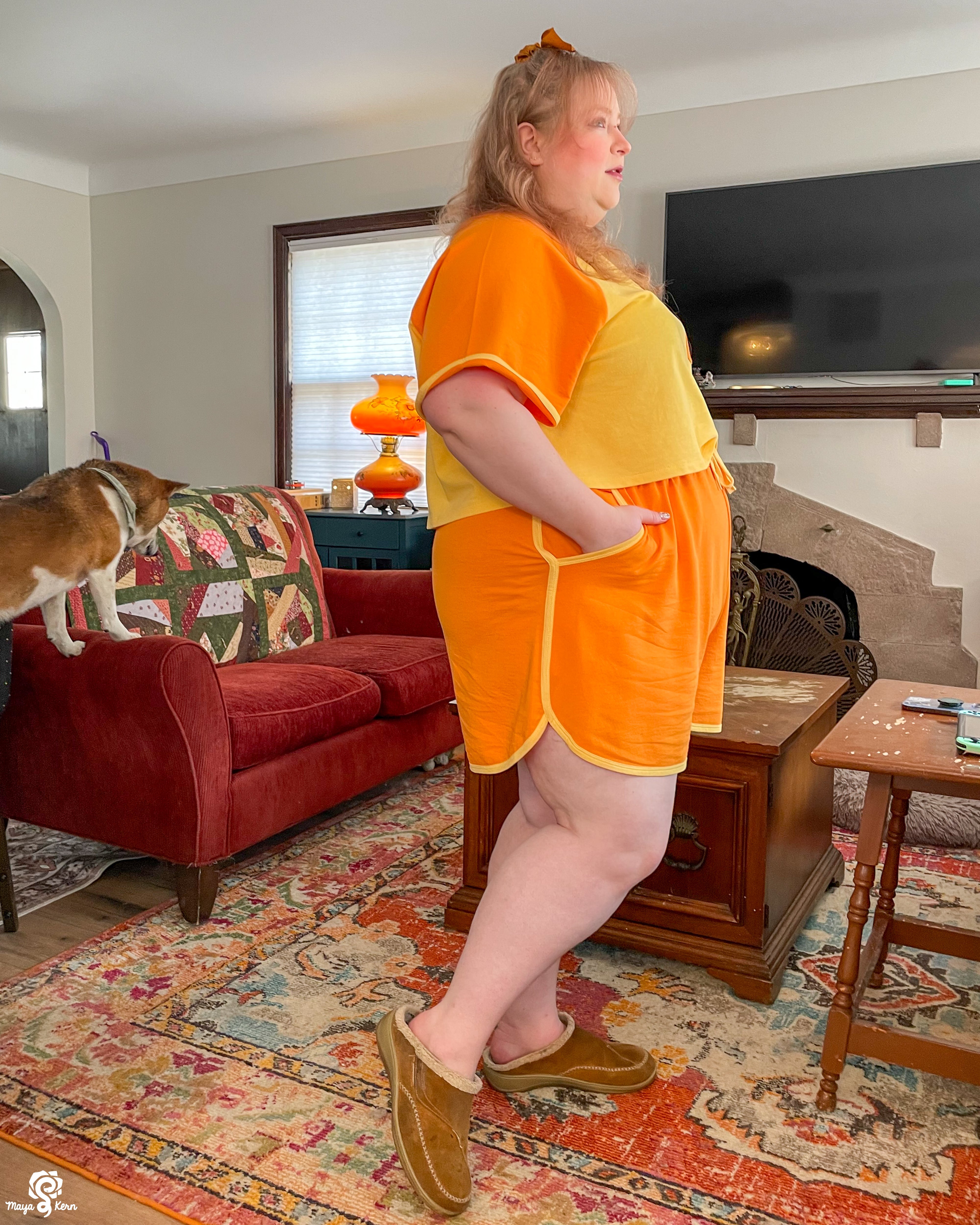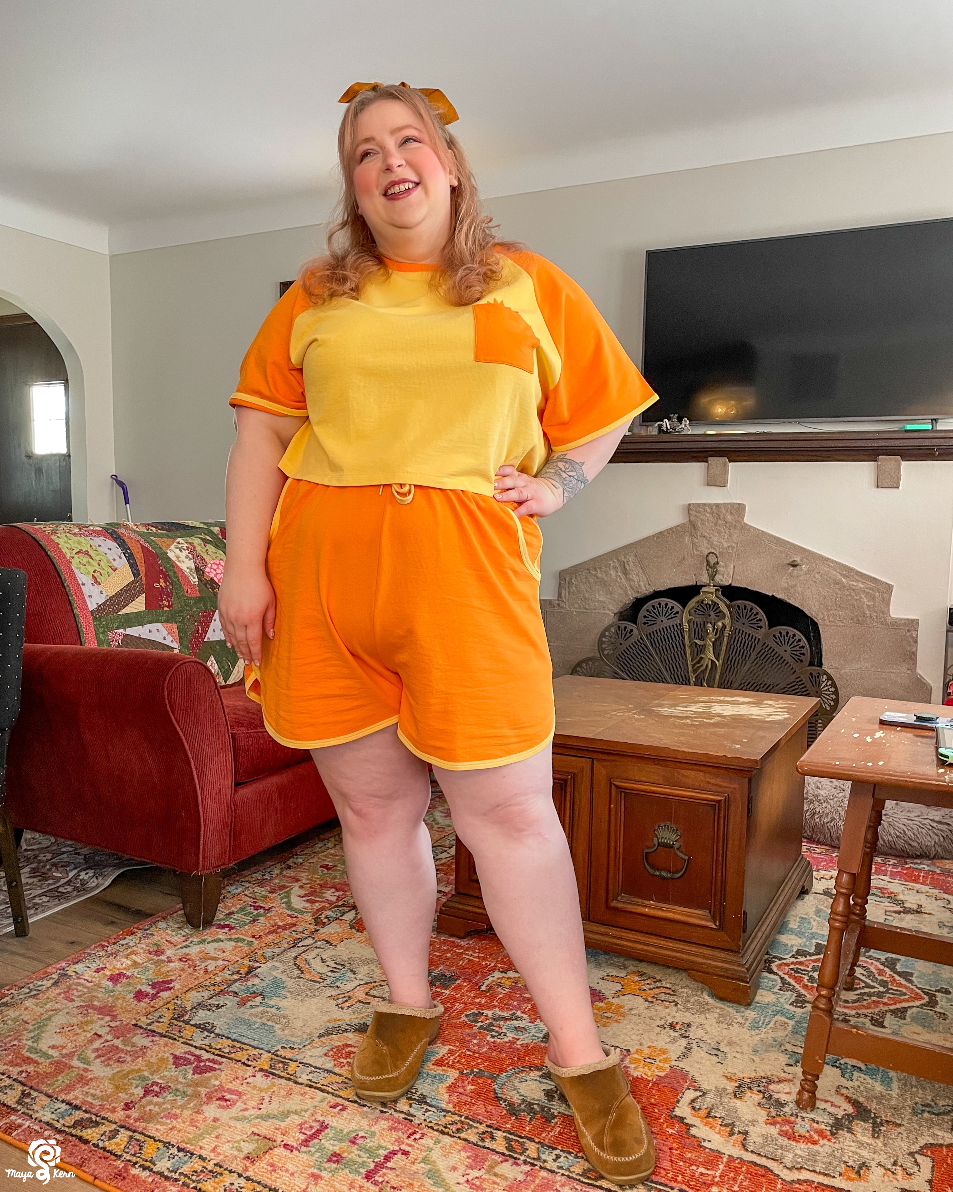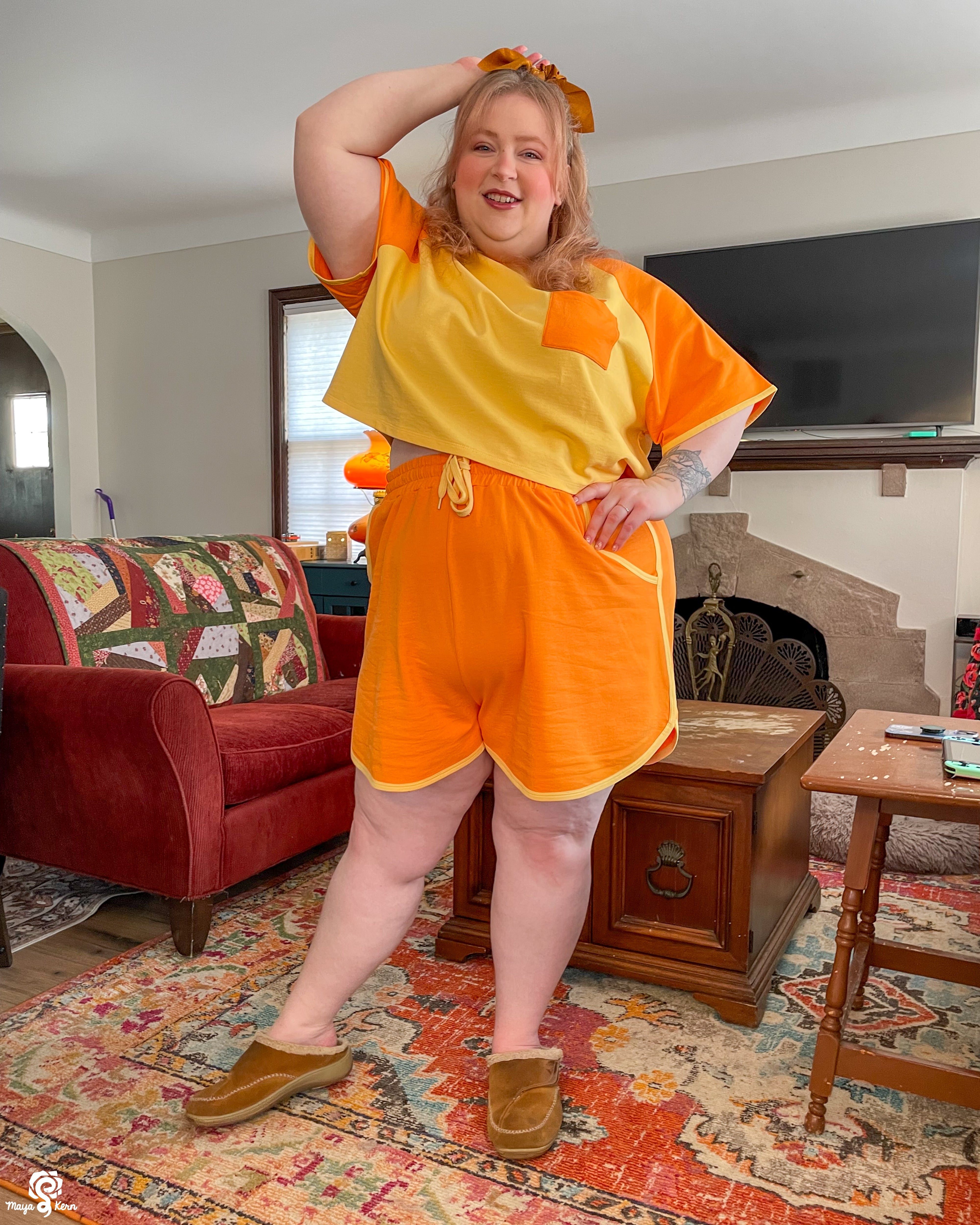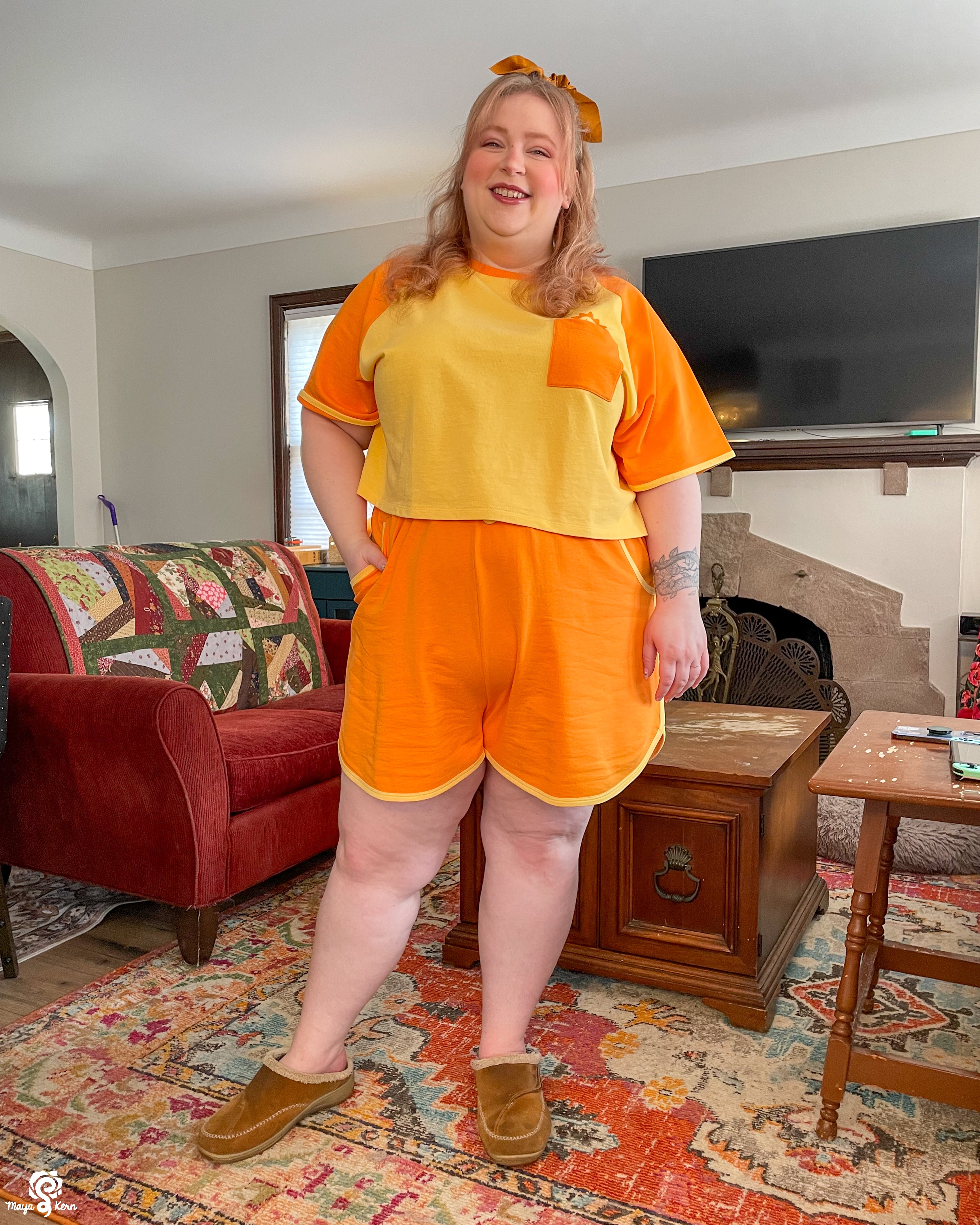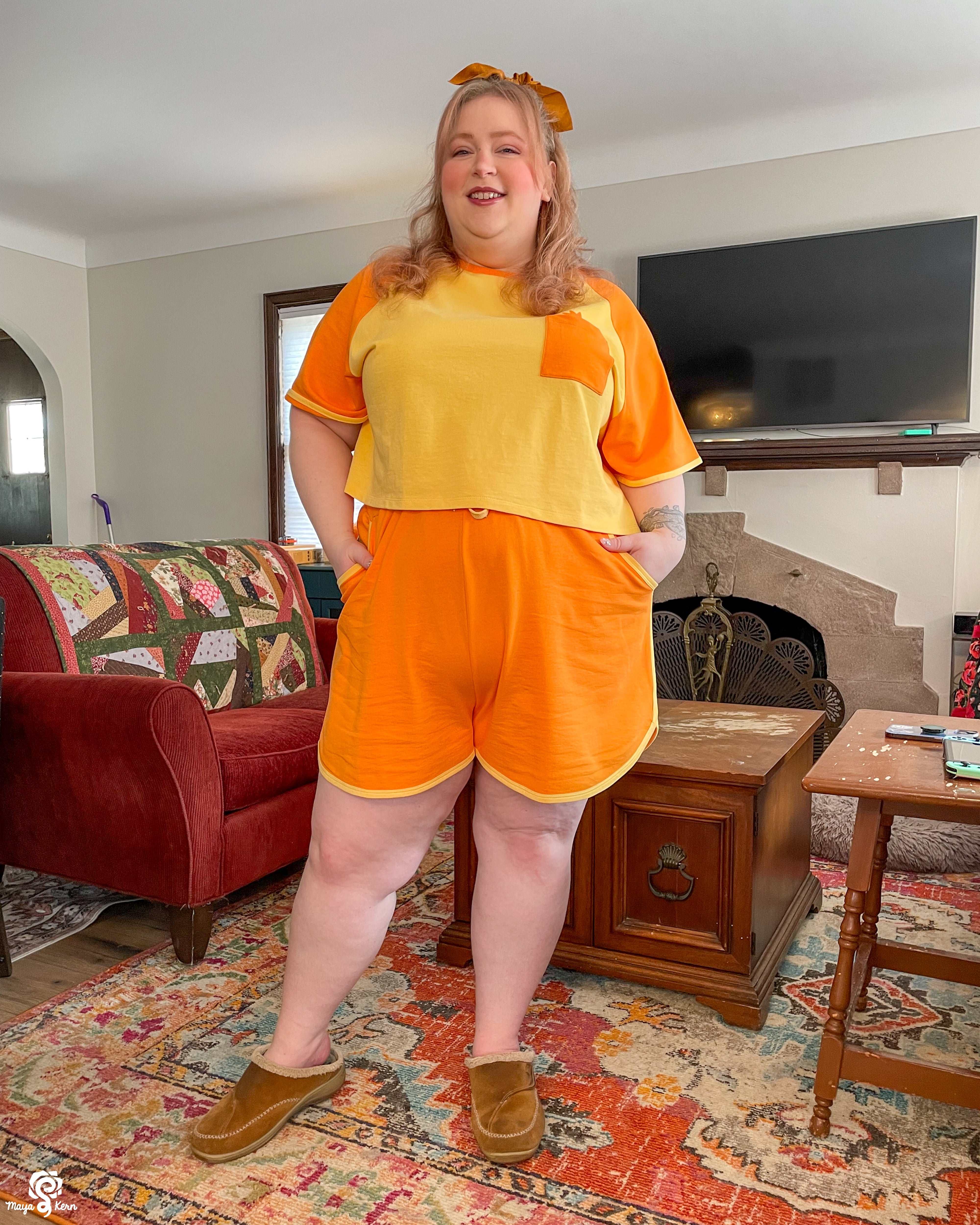 This color blocked tee features a warm and buttery yellow body, a vibrant and sunny orange neckline, sleeves and pocket, and yellow piping on the bottom of the sleeves. There is also a screen printed happy little orange sun peeking out of the pocket.