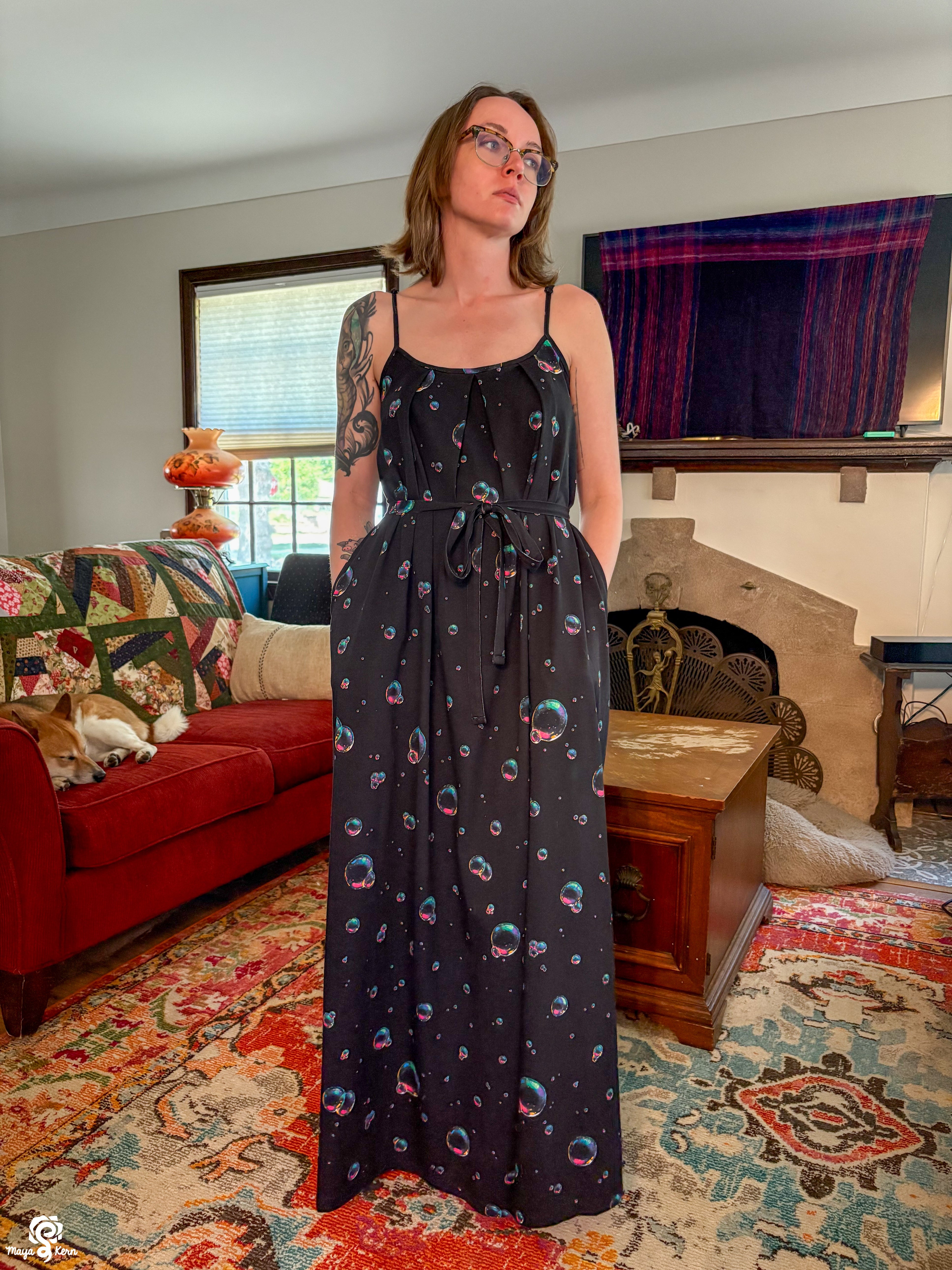 A breezy, 100% cotton maxi dress in my Bubbles pattern on a classic black background.