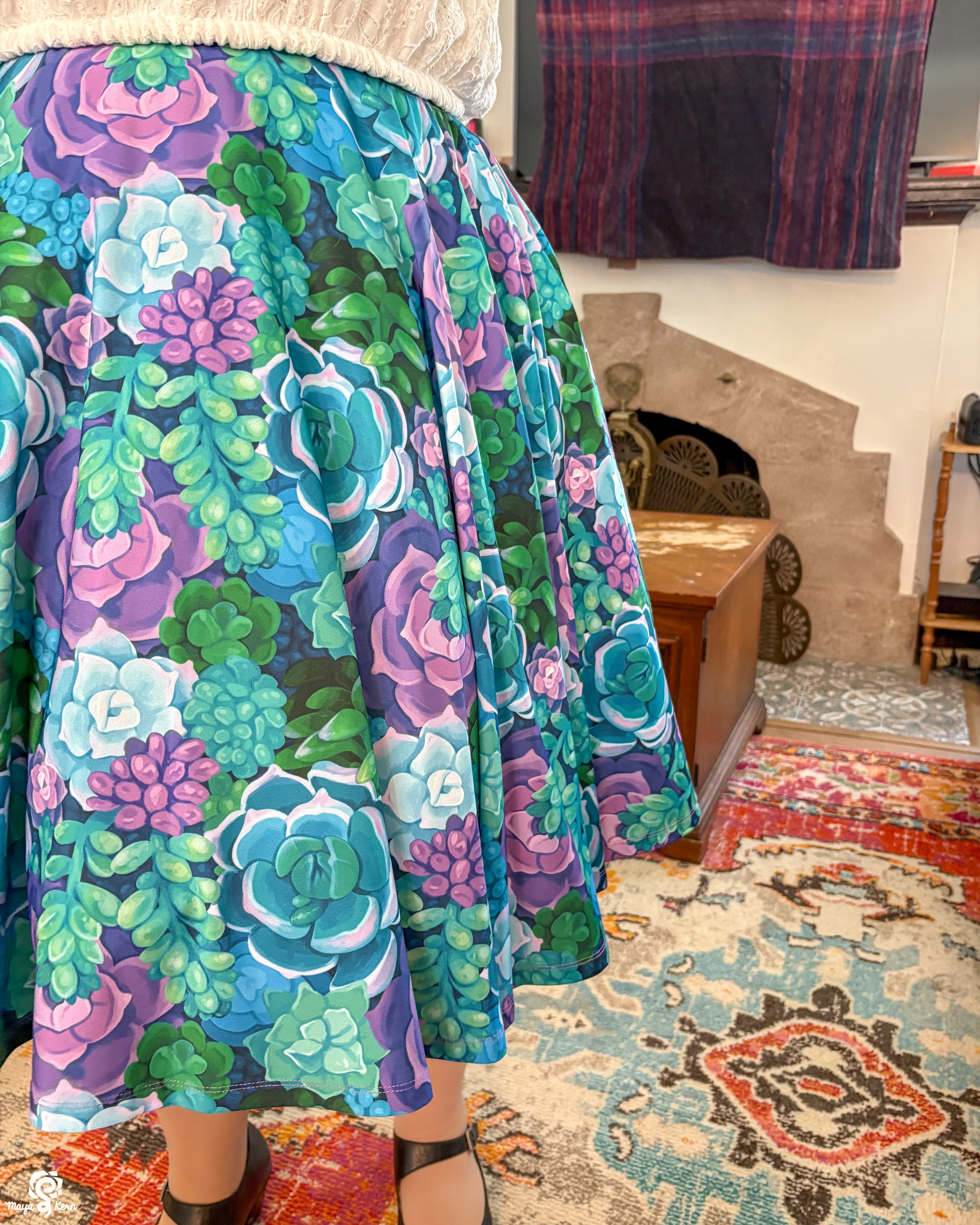 Stretchy circle skirt featuring my Succulents pattern. This pattern is predominantly rendered in shades of teal, green and purple. These skirts have pockets large enough to fit your phone, DS, Switch, hands, and maybe a small cat. Petticoat not included.